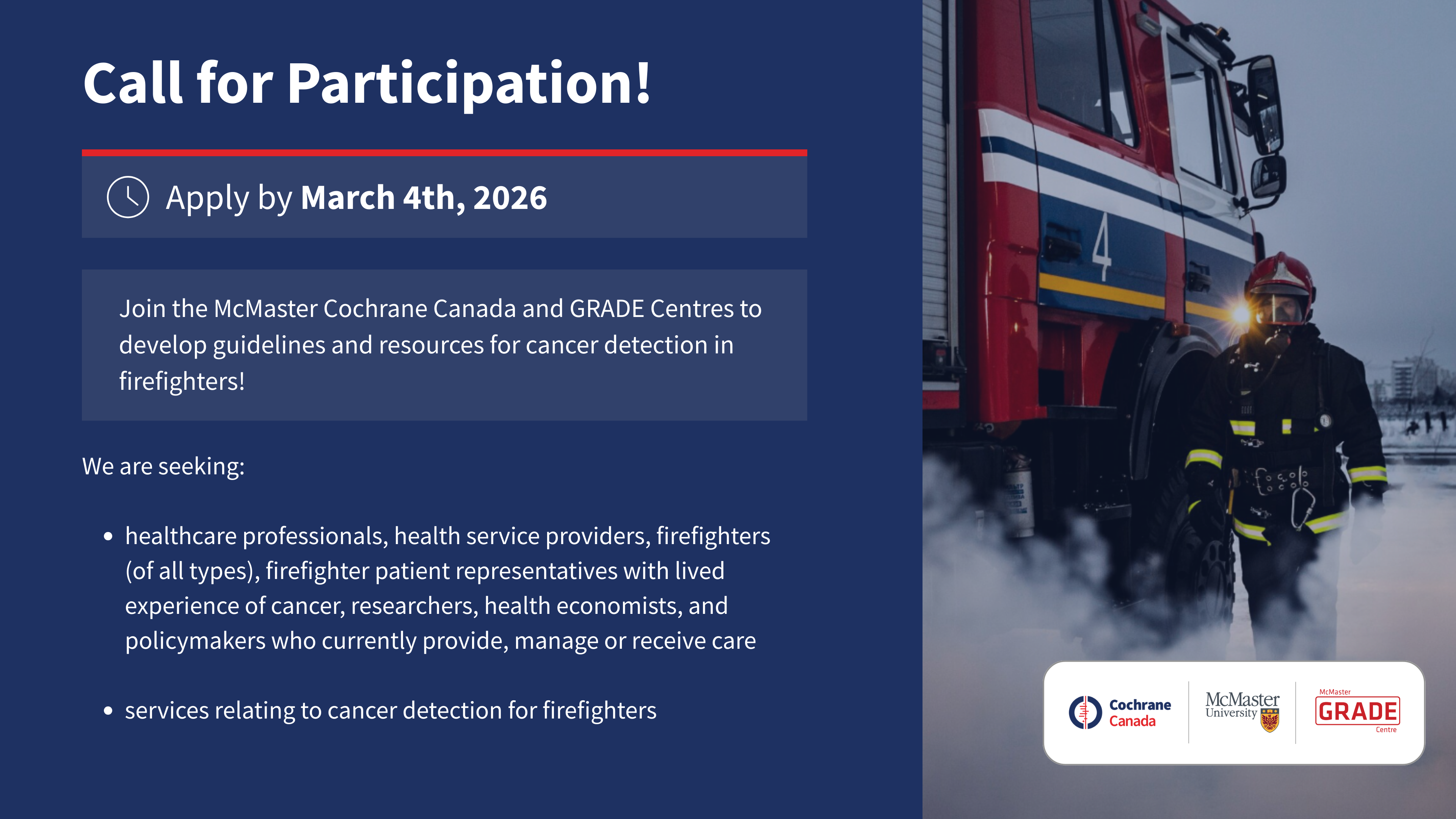 The CAN-CDF project is led by the McMaster Cochrane Canada and GRADE Centres and funded by Health Canada. The project will develop evidence-based guidelines and tools to support cancer detection for firefighters, who face a higher risk of cancer due to their work. Recommendations and resources will be tailored for Canada’s healthcare and fire sectors. With your participation, we can better protect firefighters by improving their cancer care, strengthen healthcare professional training and practice, improve awareness of firefighter-specific cancer risks, and support informed decision-making between patients and healthcare providers across Canada. Read more about the project: here.