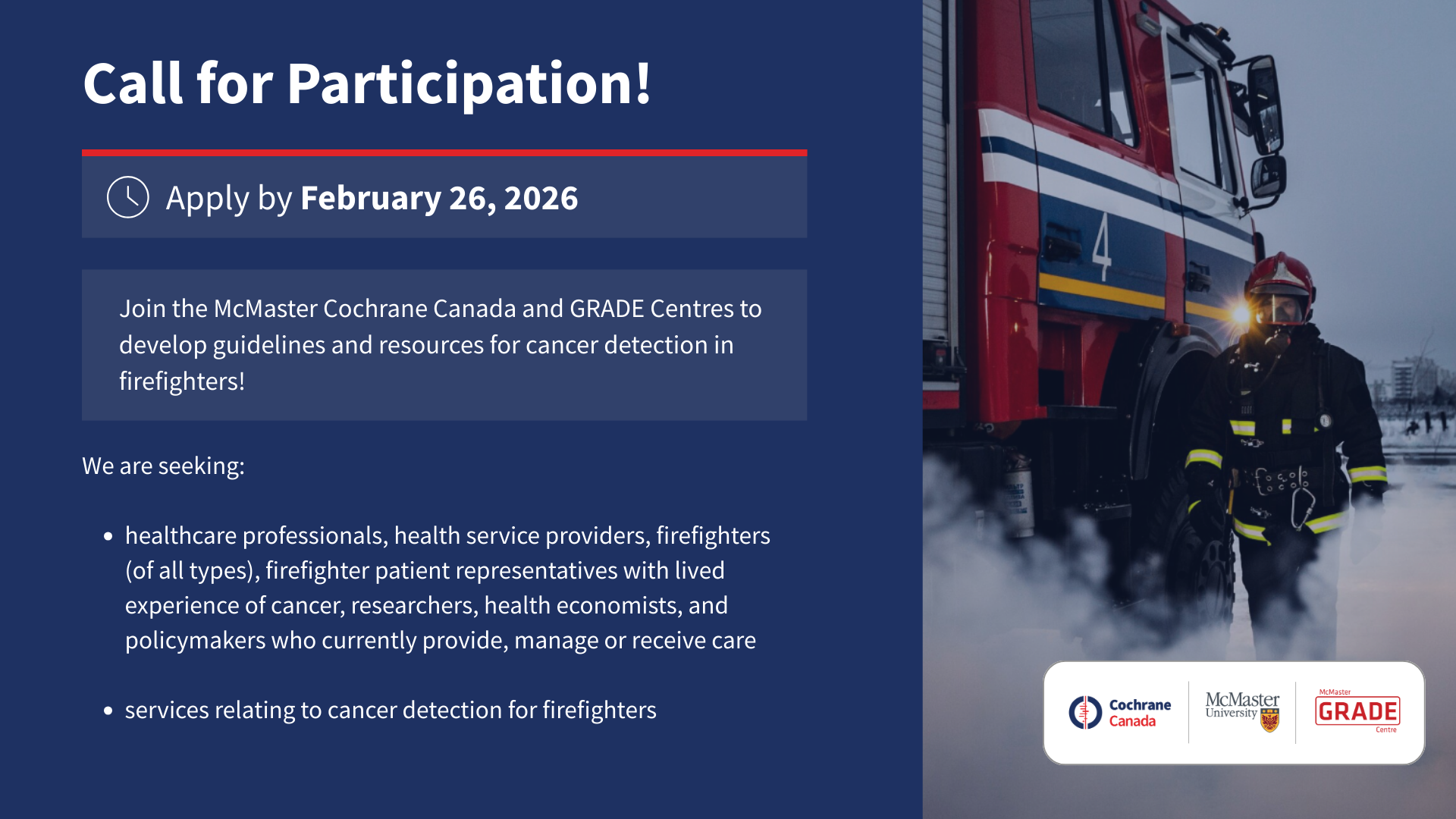 The CAN-CDF project is led by the McMaster Cochrane Canada and GRADE Centres and funded by Health Canada. The project will develop evidence-based guidelines and tools to support cancer detection for firefighters, who face a higher risk of cancer due to their work. Recommendations and resources will be tailored for Canada’s healthcare and fire sectors. With your participation, we can better protect firefighters by improving their cancer care, strengthen healthcare professional training and practice, improve awareness of firefighter-specific cancer risks, and support informed decision-making between patients and healthcare providers across Canada. Read more about the project: here.