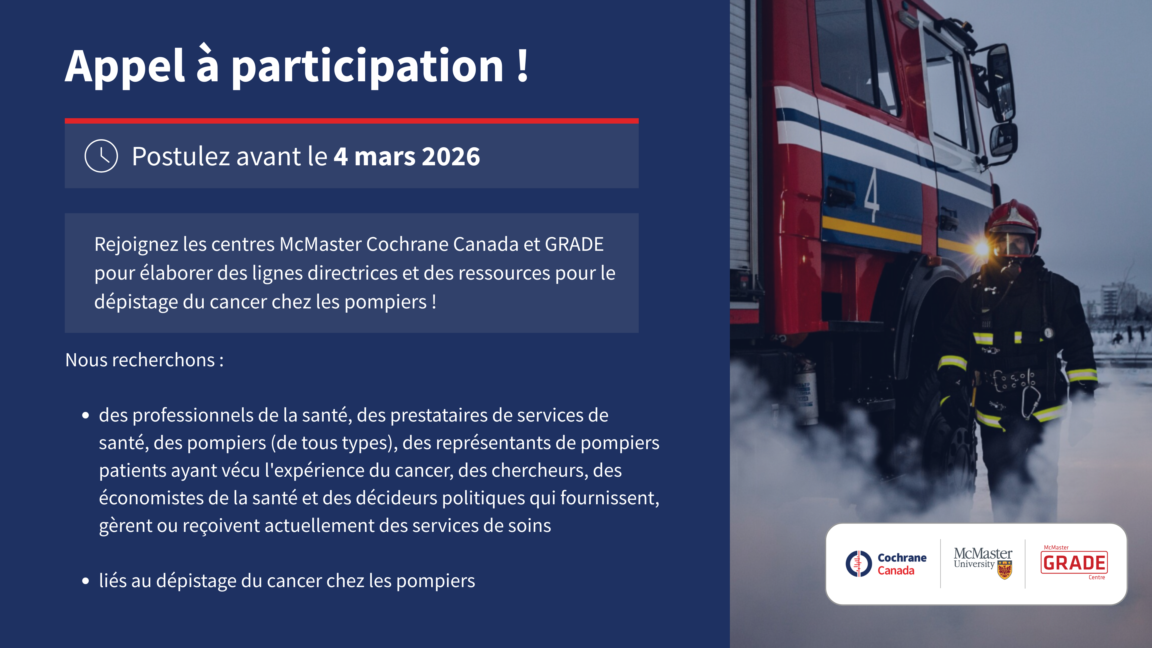 Le projet CAN-CDF est dirigé par les centres McMaster Cochrane Canada et GRADE et financé par Santé Canada. Le projet permettra d’élaborer des lignes directrices et des outils fondés sur des données probantes afin de faciliter le dépistage du cancer chez les pompiers, qui sont exposés à un risque plus élevé de cancer en raison de leur travail. Les recommandations et les ressources seront adaptées aux secteurs des soins de santé et de la lutte contre les incendies au Canada. Avec votre contribution, nous pourrons mieux protéger les pompiers en améliorant les soins qu’ils reçoivent en cas de cancer, en renforçant la formation et la pratique des professionnels de la santé, en sensibilisant davantage aux risques de cancer spécifiques aux pompiers et en favorisant la prise de décisions éclairées entre les patients et les prestataires de soins de santé partout au Canada. Pour en savoir plus sur le projet : cliquez ici.
